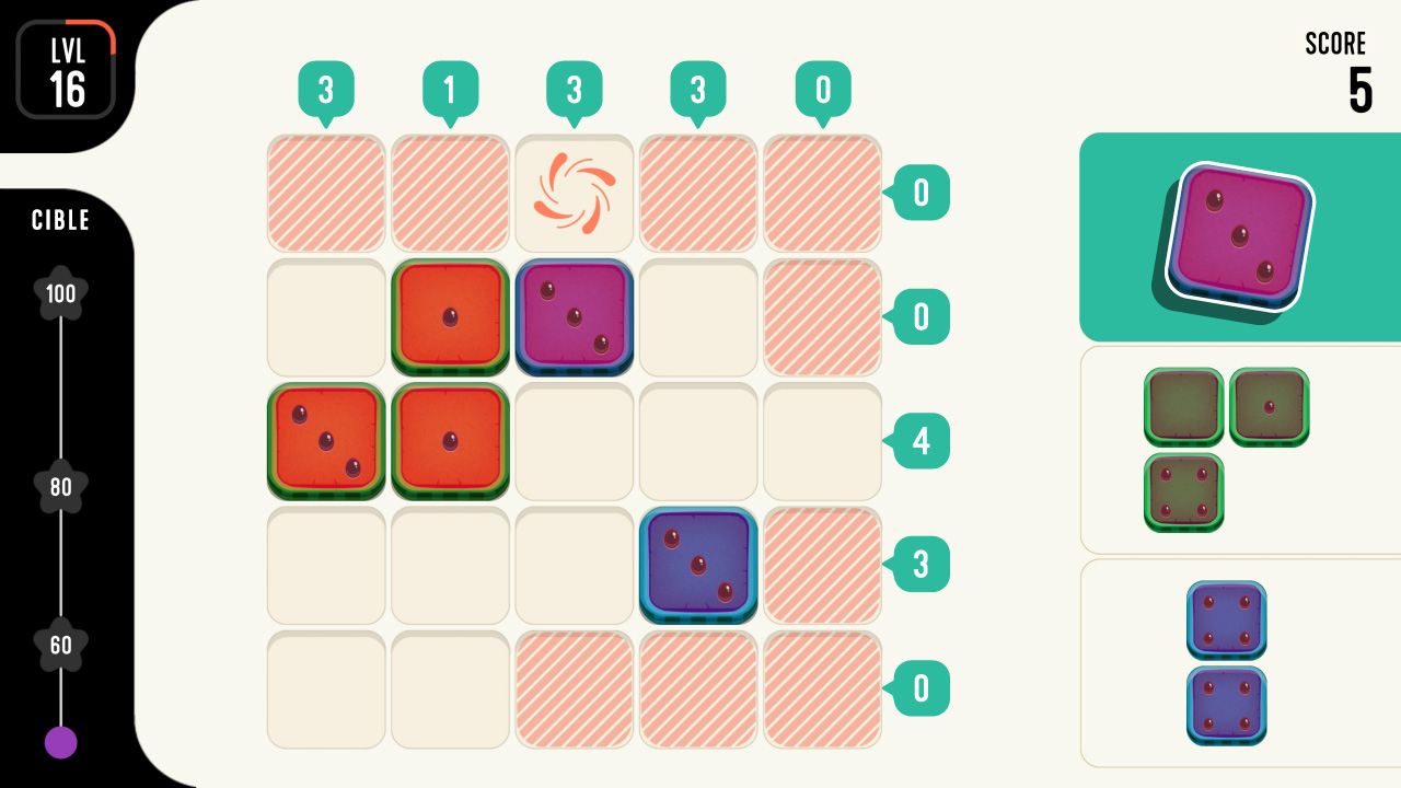 En combinant des puzzles de type sudoku avec un gameplay basé sur le placement de blocs, l'objectif de TENS! est simple : placer des dés sur le tableau, former des « dix » dans n'importe quelle rangée ou colonne et vider le tableau pour gagner.